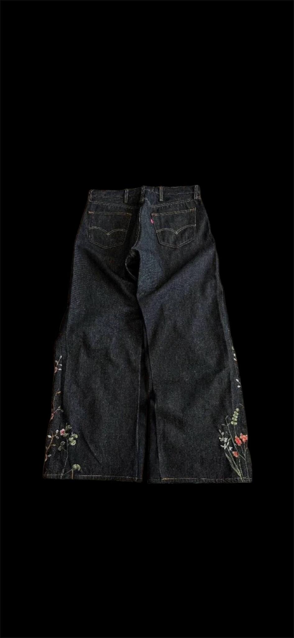 Эти джинсы мгновенно приковывают к себе внимание благодаря замысловатой цветочной вышивке и контрастным цветным швам, которые подчеркивают свободный силуэт. Несмотря на визуальную объемность, джинсы выполнены из эластичного трикотажного денима.